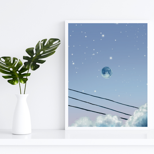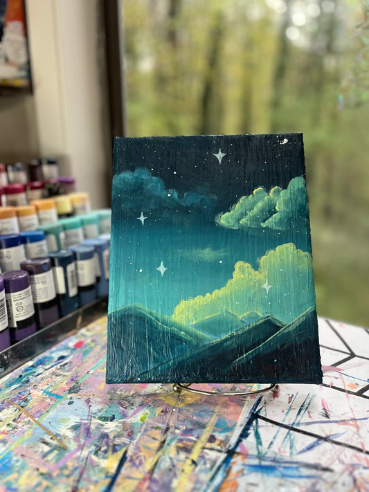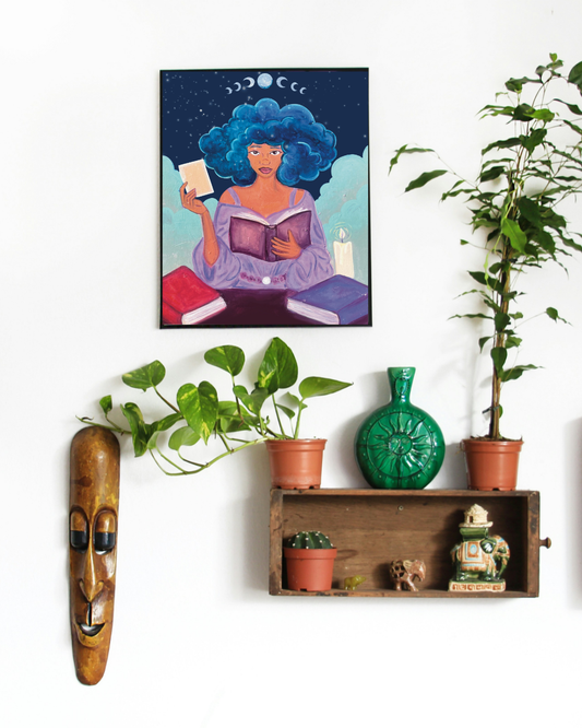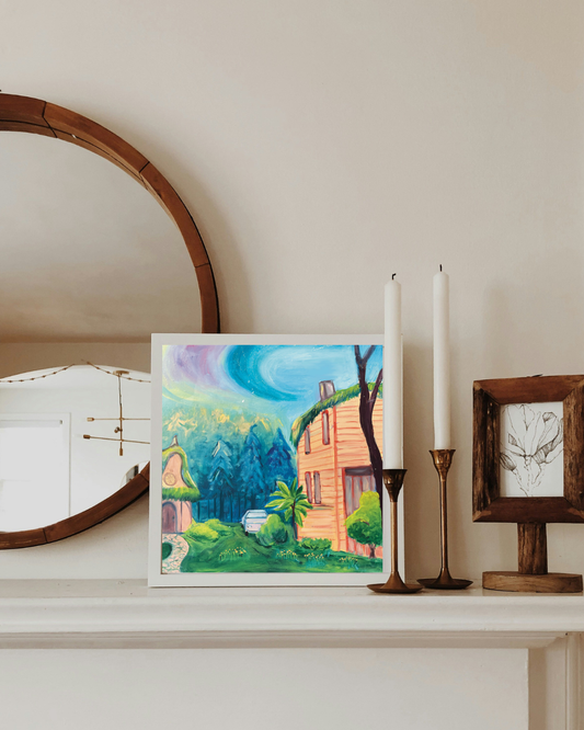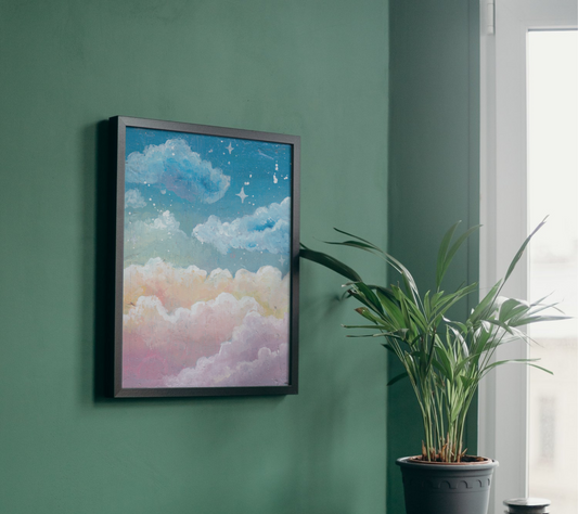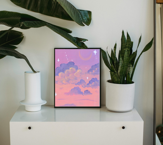 I am most known for my imaginative cloud-spaces and dreamy worlds. My work blends acrylic and gouache paintings with digital design. I love creating with bright colors and nods to spirituality and personal magic mixed in.