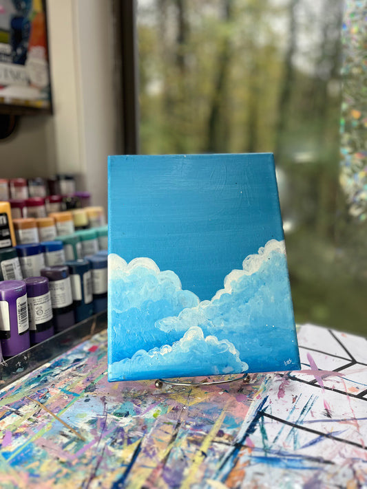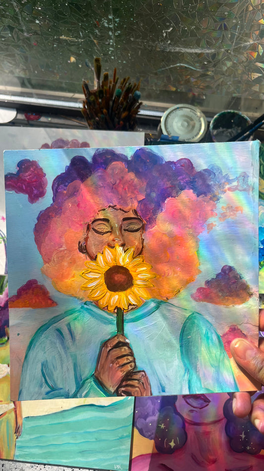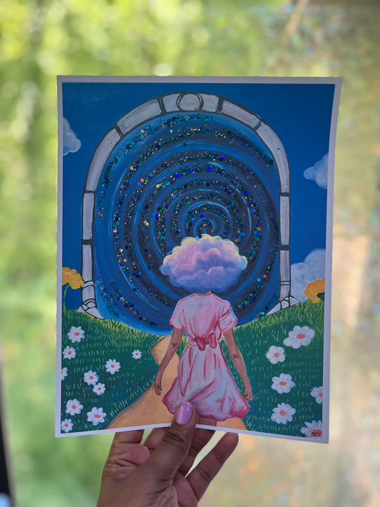 I am most known for my imaginative cloud-spaces and dreamy worlds. My work blends acrylic and gouache paintings with digital design. I love creating with bright colors and nods to spirituality and personal magic mixed in.