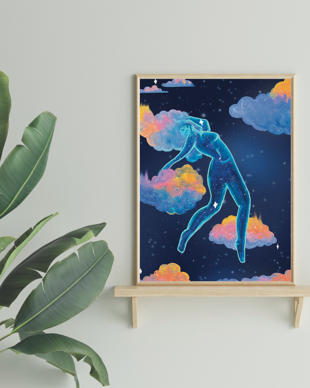 This atmospheric cloudscape art print brings a touch of serenity and wonder to your space. Inspired by ethereal skies and dreamy horizons, this high-quality print of an original acrylic painting captures the delicate beauty of clouds in a calming, balanced palette. Perfect for those seeking aesthetic wall decor, this piece invites a peaceful reflection wherever it’s placed—whether in a bedroom, living room, or creative workspace.