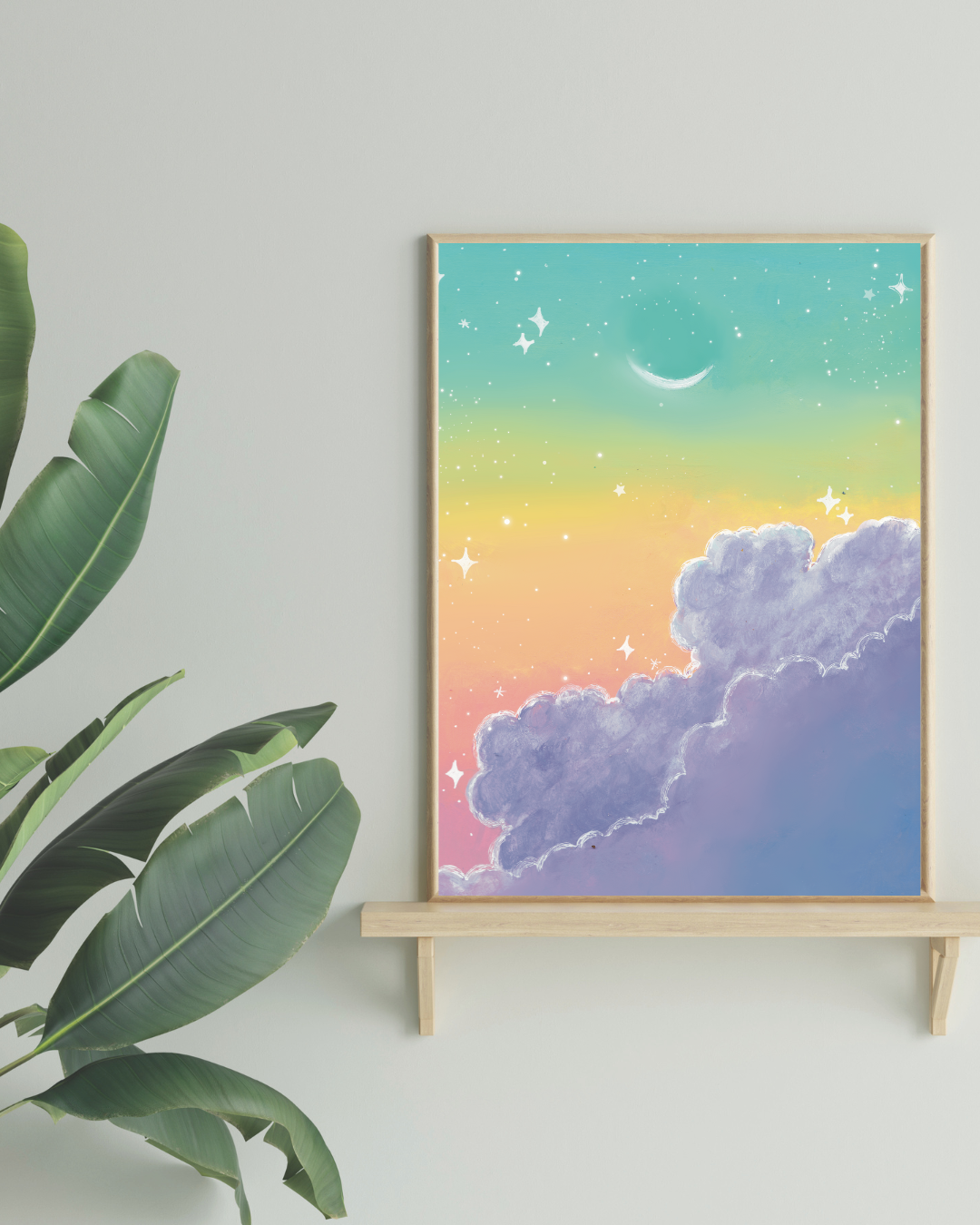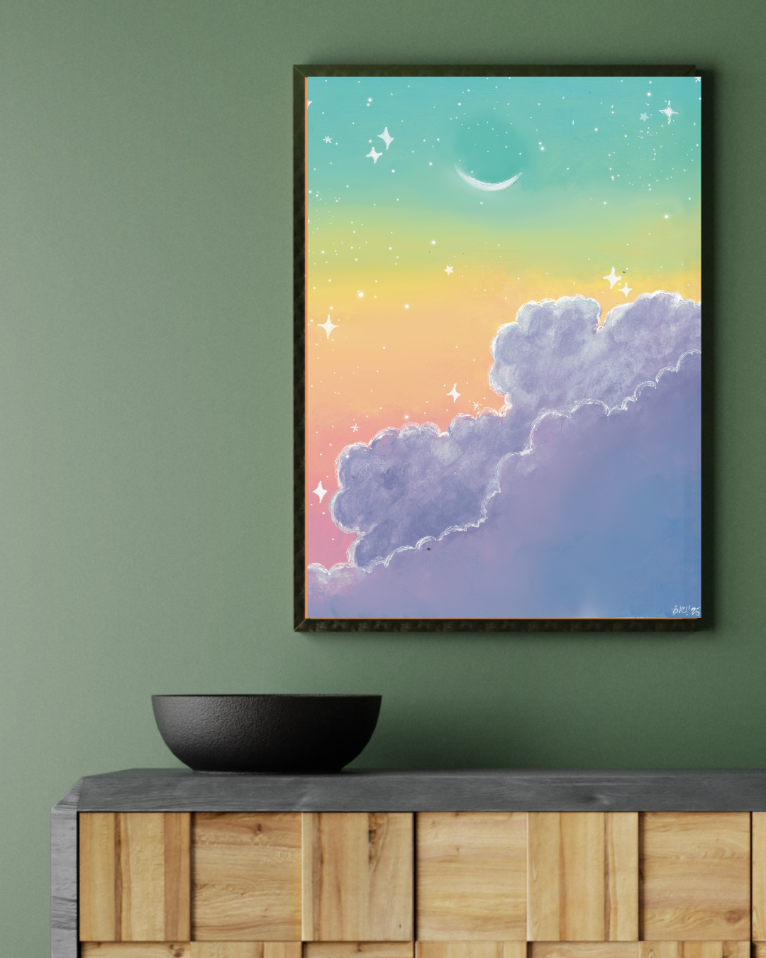 This atmospheric cloudscape art print brings a touch of serenity and wonder to your space. Inspired by ethereal skies and dreamy horizons, this high-quality print of an original acrylic painting captures the delicate beauty of clouds in a calming, balanced palette. Perfect for those seeking aesthetic wall decor, this piece invites a peaceful reflection wherever it’s placed—whether in a bedroom, living room, or creative workspace.